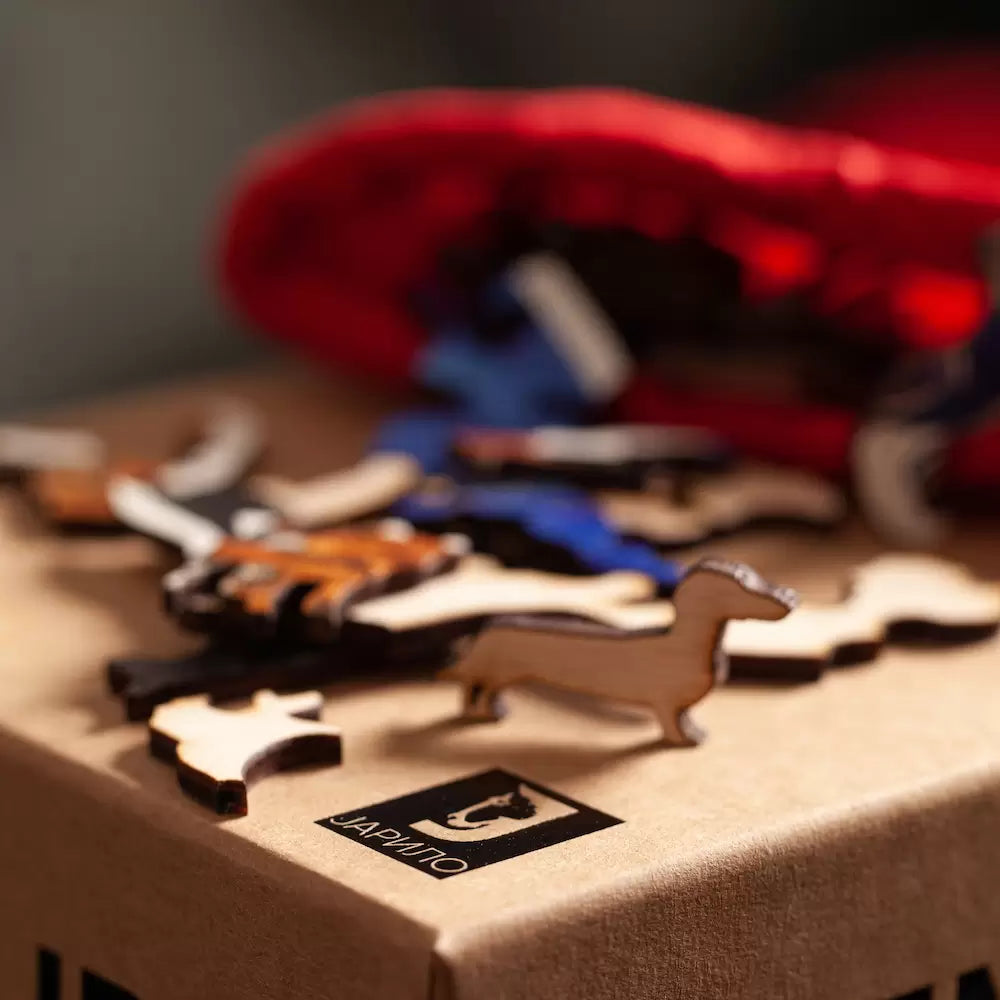 Kad sastavite slagalicu dobijete velikog drvenog psa, sastavljenog od stotine malih pasa, raznih rasa i svakodnevnih predmeta iz psećeg života.